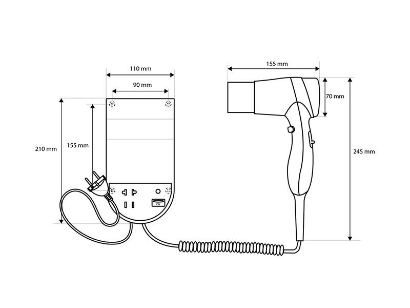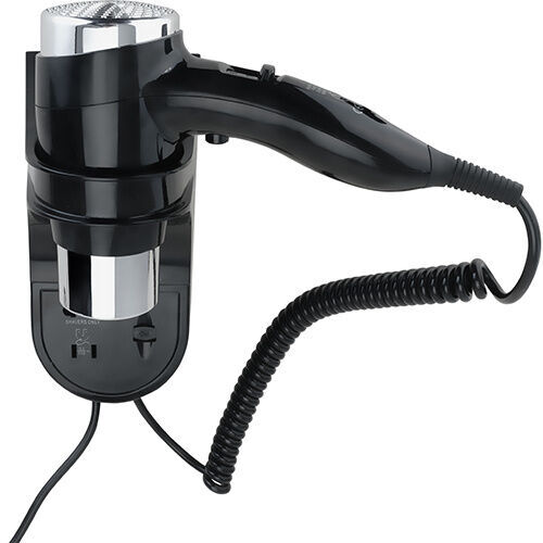 Černý fén s držákem z pevného plastu o výkonu 1600 W má spirálovitý typ kabelu, volit lze ze 3 teplotních stupňů a 2 rychlostních stupňů. Fén disponuje integrovanou zásuvkou na holicí strojek.