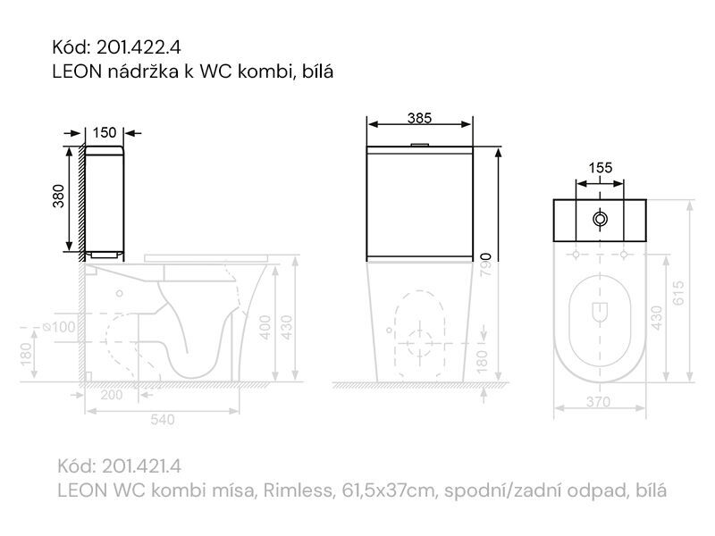 Bruckner LEON WC kombi mísa, Rimless, 61,5x37 cm, spodní/zadní odpad, bílá