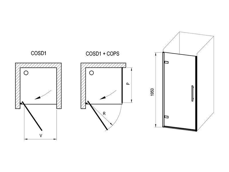 Otočením výrobku o 180° získáte levou nebo pravou variantu otevírání dveří. Výrobek se montuje do vyzděné niky, nebo v kombinaci s pevnou stěnou COPS, na lité vaničky RAVAK Perseus Pro, Perseus Pro Flat, Perseus Pro Chrome, Gigant Pro, Gigant Pro Flat, Gigant Pro Chrome nebo přímo na podlahu se zabudovaným odtokovým žlabem či podlahovou vpustí. Vzpěra je součástí balení. Použitím nastavovacího profilu CONPS lze sprchové dveře rozšířit o 25 mm (na straně umístění magnetu a je využitelný pouze při instalaci v nice).