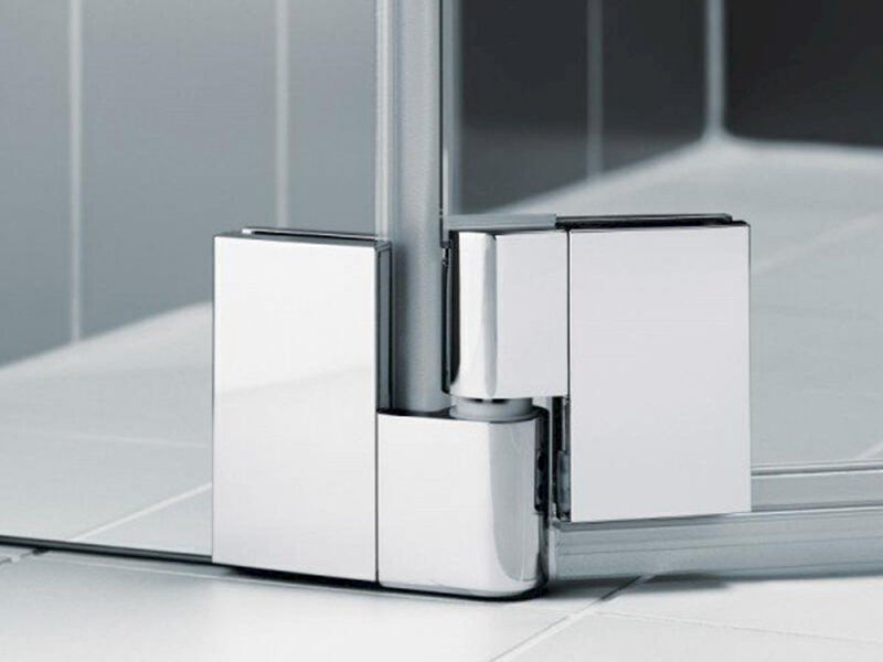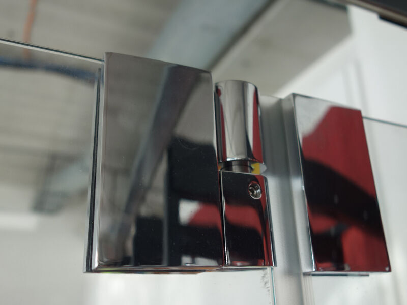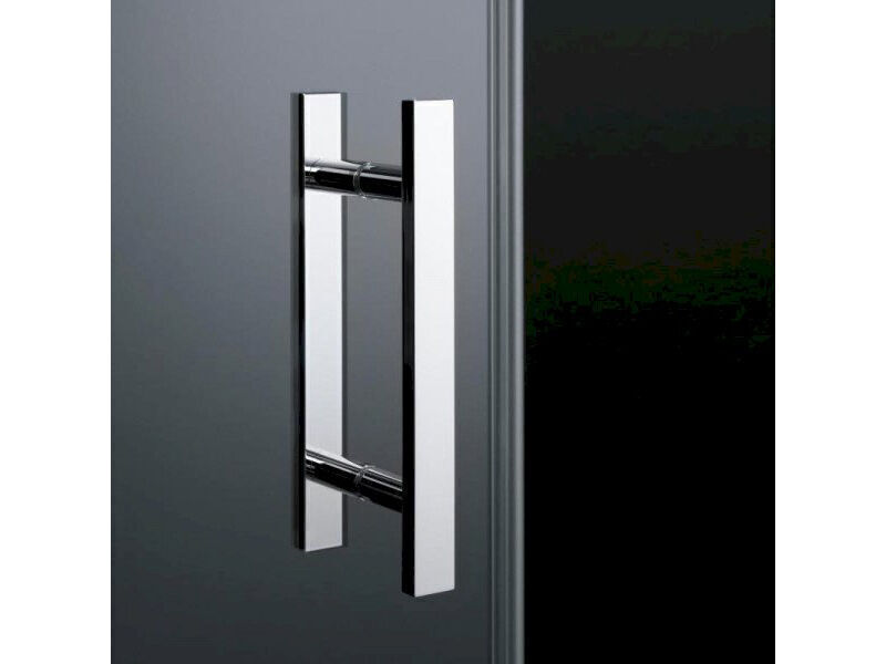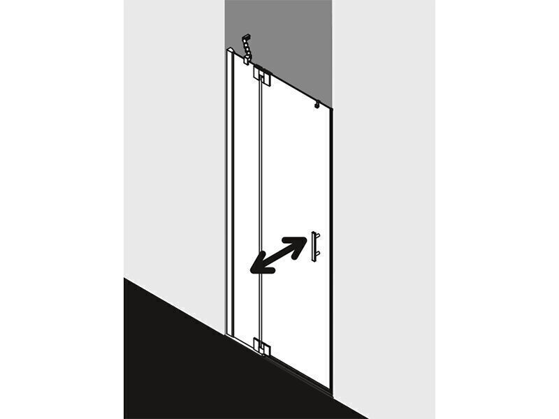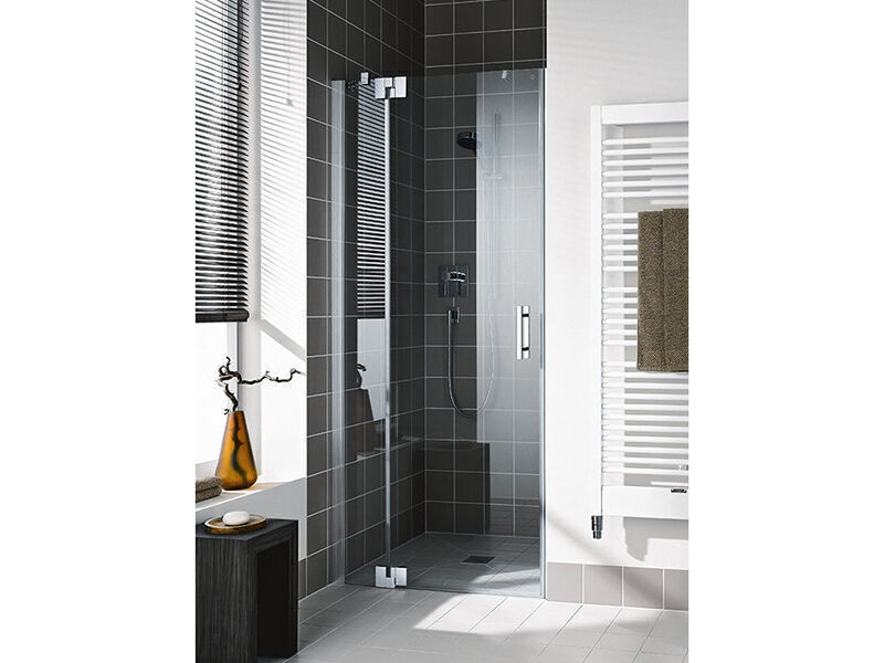 Jednokřídlé kyvné dveře Kermi Filia XP s pevným polem vlevo, instalace do niky, rozměr 90x200 cm, bezpečnostní čiré sklo 6 mm s povrchovou úpravou KermiClean, profily, panty a madla stříbrná vysoký lesk.
