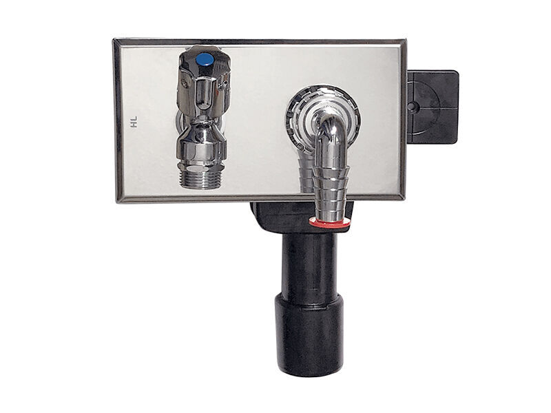 HL406 Podomítková vodní zápachová uzávěrka DN40/50 pro pračku nebo myčku nádobí s integrovanou tvarovkou pro přívod vody (mosazná nástěnka 1/2” vnitřní závit) a výtokovým ventilem na hadici (se zpětnou a zavzdušňovací armaturou). Krycí deska z nerezové oceli 180x100 mm, montážní kryt a tlaková zátka HL42 v balení.