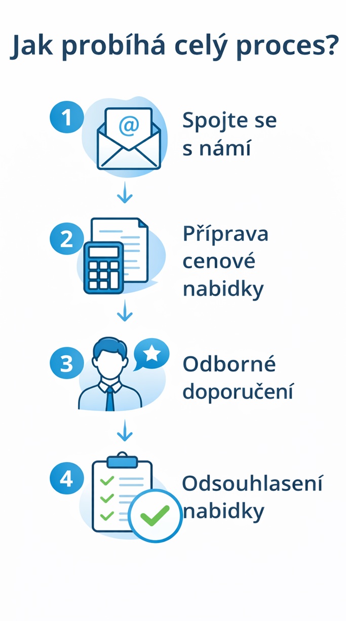 Odsouhlasení nabídky – Cenovou nabídku si v klidu projděte. Pokud vám bude vyhovovat, stačí ji potvrdit. V případě dotazů nebo připomínek jsme vám k dispozici pro další konzultaci a upřesnění detailů.