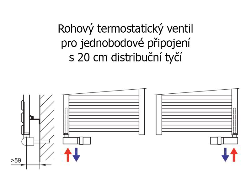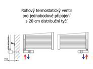 Designový termostatický ventil osazený termostatickou hlavicí pro jednobodové připojení s distribuční tyčí slouží pro připojení otopného tělesa s jednobodovým připojením k rozvodu. Termostatický ventil i regulační šroubení jsou na straně připojení do rozvodu zakončeny svěrnou spojkou Cu 15×1 mm nebo Pex-Al-Pex 16×2 mm.