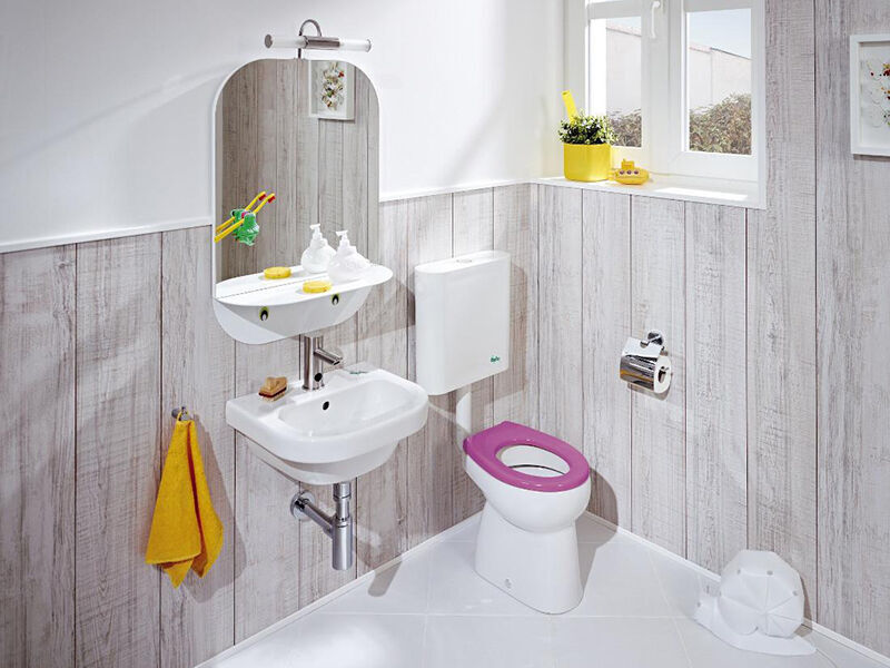 Dětská koupelna nemusí být jen v mateřské školce. Každodenní hygienu můžeme dětem zpestřit řadou šikovných doplňků, a proto jsme vyvinuli nový Baby set. Základem jsou umyvadla, umývátka, stojící klozety.