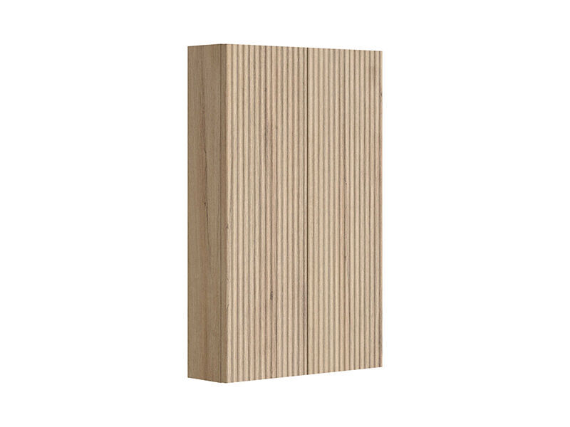 Závěsná střední mělká skříňka Cubito Style, rozměry 50x15x80 cm, materiál dřevotřísková deska tloušťka 16 mm potažená PVC fólií, 2x dveře levé/pravé, 2x skleněné police, dekor dřevo.