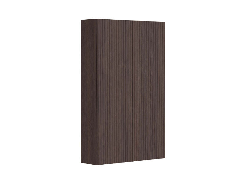 Závěsná střední mělká skříňka Cubito Style, rozměry 50x15x80 cm, materiál dřevotřísková deska tloušťka 16 mm potažená PVC fólií, 2x dveře levé/pravé, 2x skleněné police, dekor tmavý ořech.