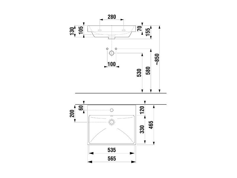 Závěsné umyvadlo Cubito Style, rozměr 56,5x46,5 cm, s přepadem, otvor pro baterii uprostřed. Možno instalovat samostatně na stěnu nebo se skříňkou pod umyvadlo, materiál sanitární keramika, barva bílá.