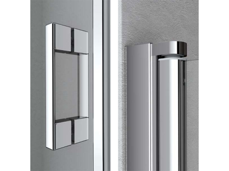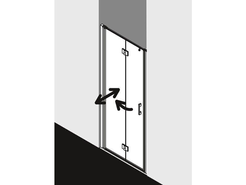 Dvoukřídlé kyvné skládací dveře Kermi Liga k montáži do niky nebo pro kombinaci s boční stěnou LI TWD a LI TVD, rozměr 86-91x200 cm, bezpečnostní čiré sklo 5 mm s povrchovou úpravou KermiClean, profily, panty a madla stříbrná mat.