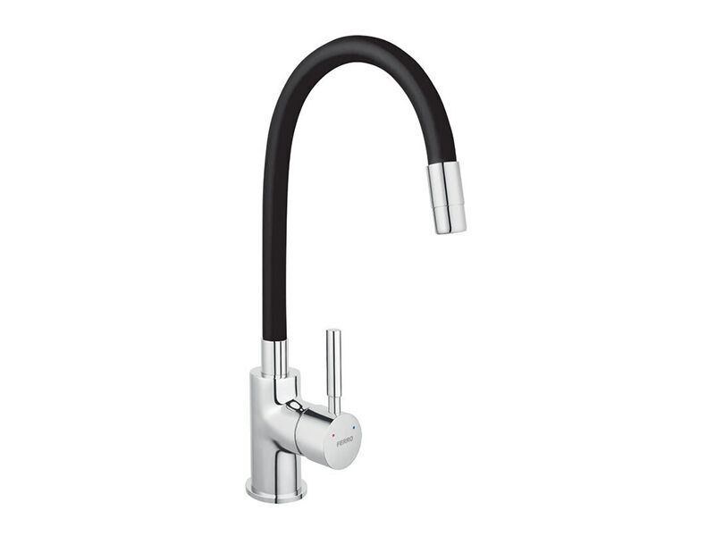 Dřezová stojánková baterie s elastickým černým ramenem, keramická kartuše, materiál kov, přívodní hadičky, délka ramene 15-35 cm.