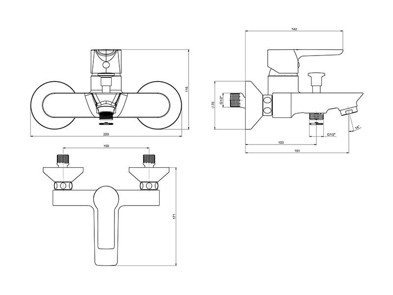 Vanová nástěnná baterie Ponta Style, rozteč 15 cm, výška baterie 11,6 cm, materiál kov, povrchová úprava chrom.