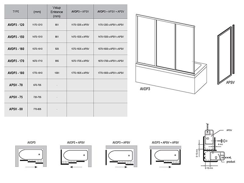Vanové posuvné dveře Ravak Supernova AVDP3 jsou určeny k pravé či levé instalaci. Otočením výrobku o 180° získáme variantu s pravým/levým vstupem. Výrobek je možné rozšířit pomocí nastavovacího profilu o šířce 2 cm. Díky výšce panelu 137 cm poskytne zástěna dostatečnou ochranu proti stříkající vodě a variabilní délka 117 – 121 cm značně zjednoduší instalaci.