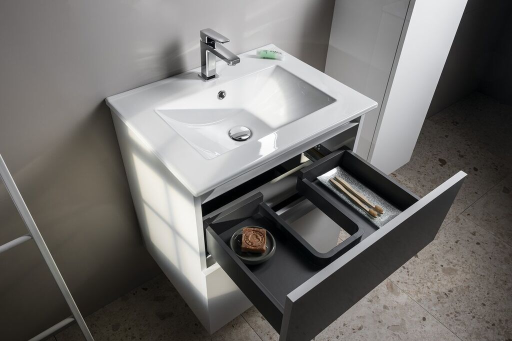 Zásuvky jsou vybaveny výsuvy s pomalým dojezdem a automatickým dovřením. Úložný prostor lze rozšířit přidáním doplňkových skříněk ESPACE. Nábytek je dodáván ve smontovaném stavu, připravený k okamžité instalaci.