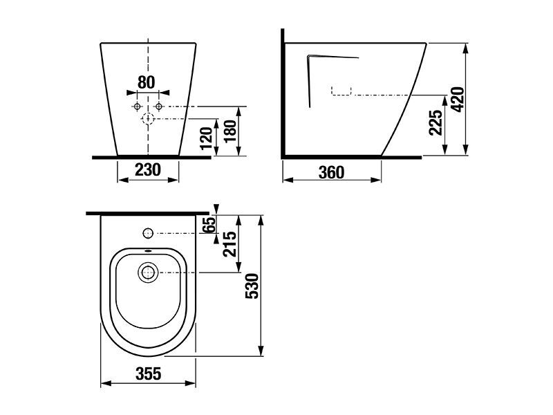 Stojící bidet Cubito Style, kapotovaná verze ke zdi, otvor pro baterii uprostřed, rozměry 53x35,5x42 cm, bez postranních otvorů pro přívod vody, včetně instalační sady pro uchycení do podlahy, materiál sanitární keramika, barva bílá.