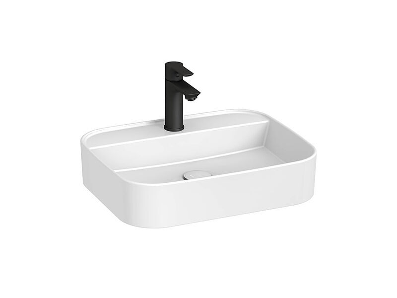 Obdélníková umyvadlová mísa 44x40 cm, otvor pro baterii, bez přepadu, vhodné k instalaci na umyvadlovou desku, materiál sanitární keramika, barva bílá. Neuzavíratelná umyvadlová výpust s keramickou krytkou je součástí dodávky.